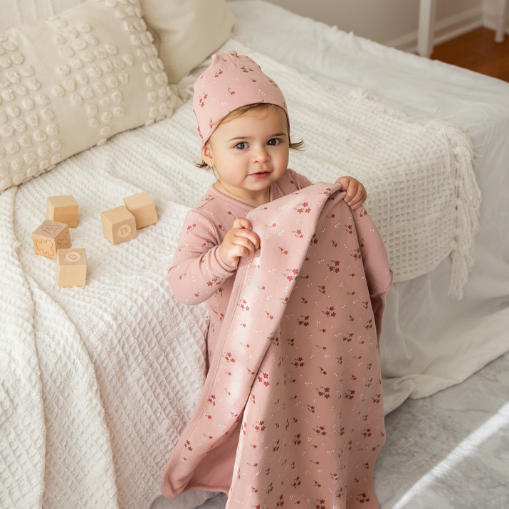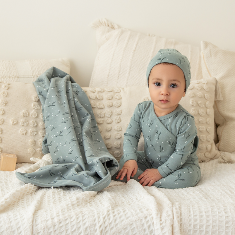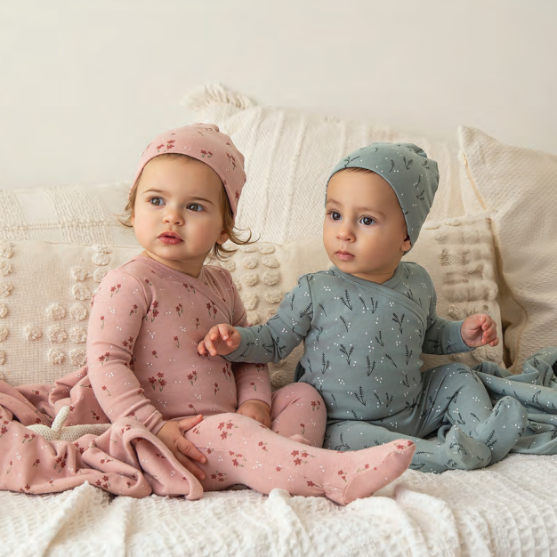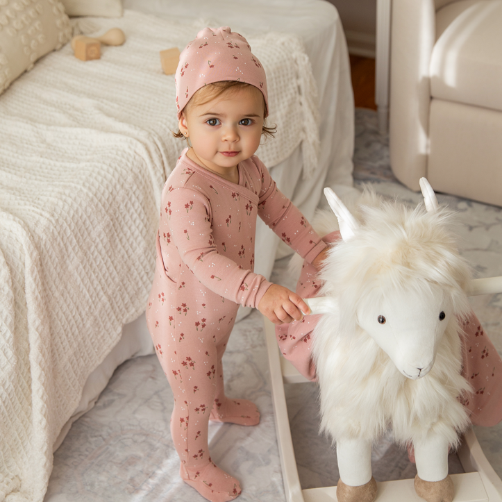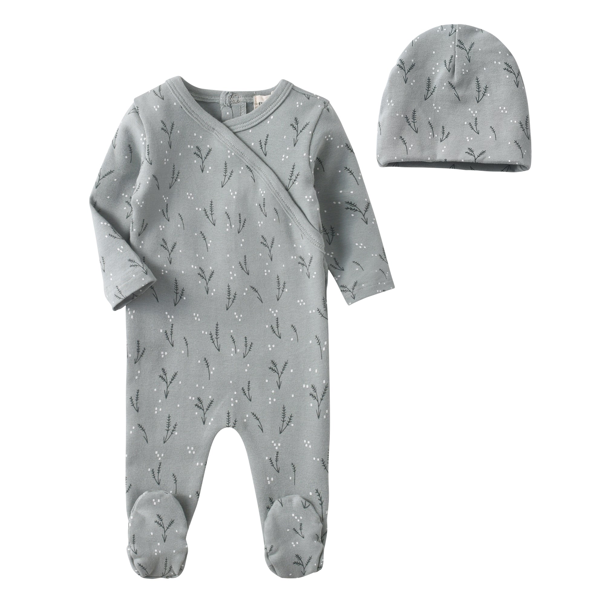 This snug fitting footie is designed with a floral print and wrap detail, and a back snap closure. Available in sizes 3-18 months. Comes with a matching beanie. This footie comes in 2 attractive colors and is crafted with the softest cotton fabric for ultimate comfort.