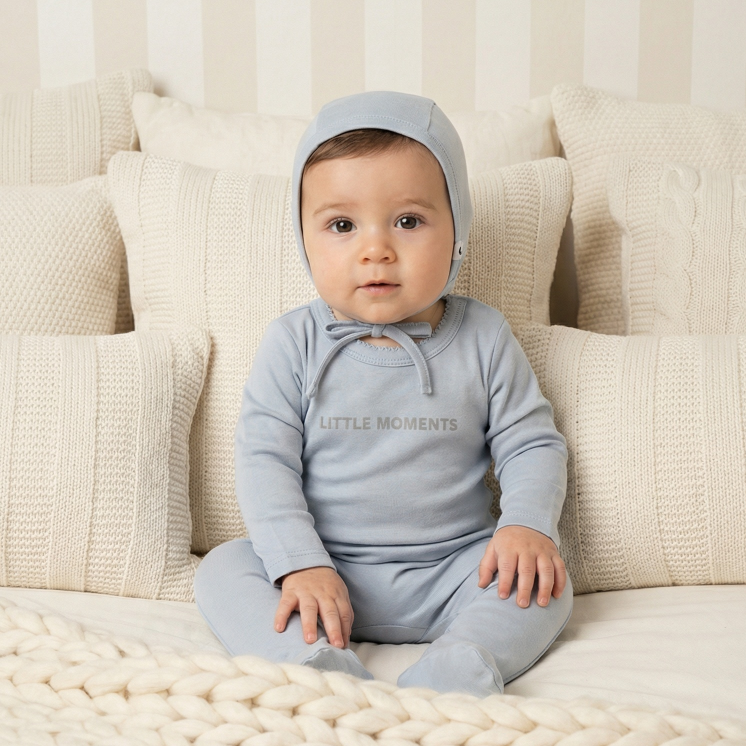 This snug fitting footie is designed with a print detail and a back snap closure. Available in sizes 3-18 months. It come with a matching bonnet. This footie comes in 2 attractive colors and is crafted with the softest cotton fabric for ultimate comfort.