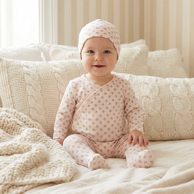 This snug fitting footie is designed with a print detail and a back snap closure. Available in sizes 3-18 months. It come with a matching beanie. This footie comes in 2 attractive colors and is crafted with the softest cotton fabric for ultimate comfort.