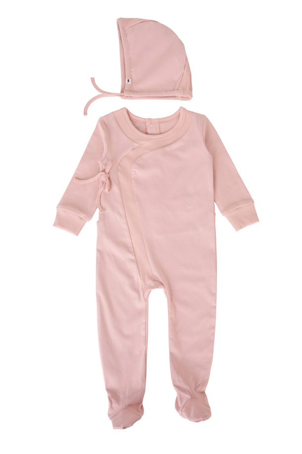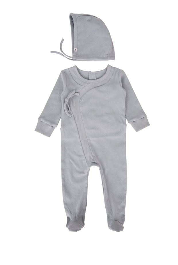 This snug fitting footie is designed with a ribbed wrap detail and a back snap closure. Available in sizes 3-18 months. It come with a matching bonnet. This footie comes in 2 attractive colors and is crafted with the softest cotton fabric for ultimate comfort.