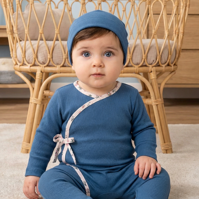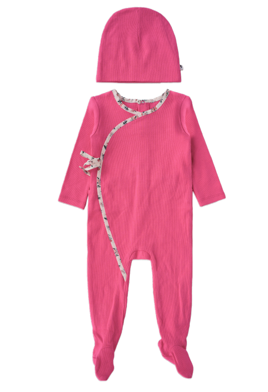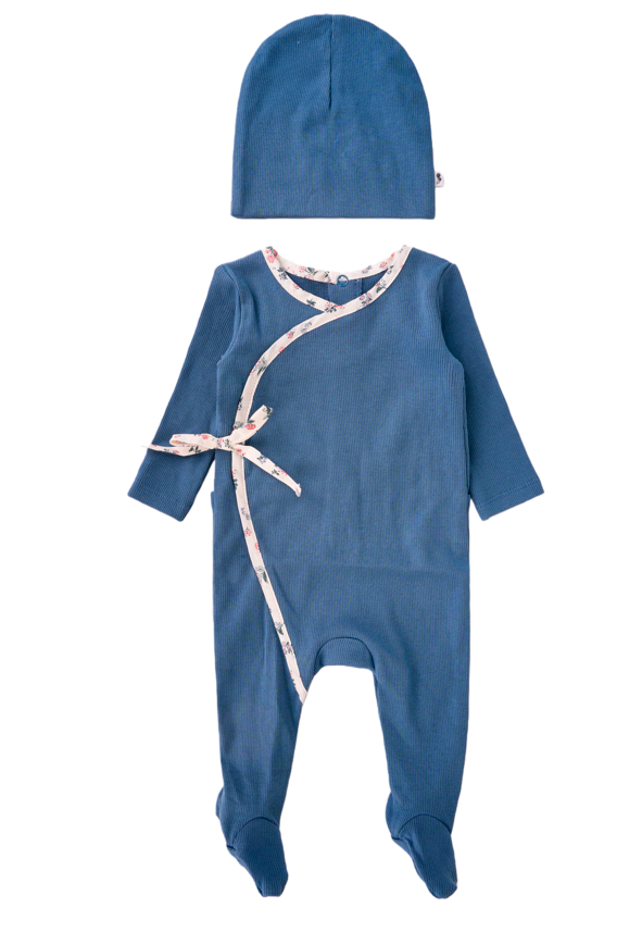 This snug fitting footie is designed with a floral wrap detail and a back snap closure. Available in sizes 3-18 months. It come with a matching beanie. This footie comes in 2 attractive colors and is crafted with the softest cotton fabric for ultimate comfort.