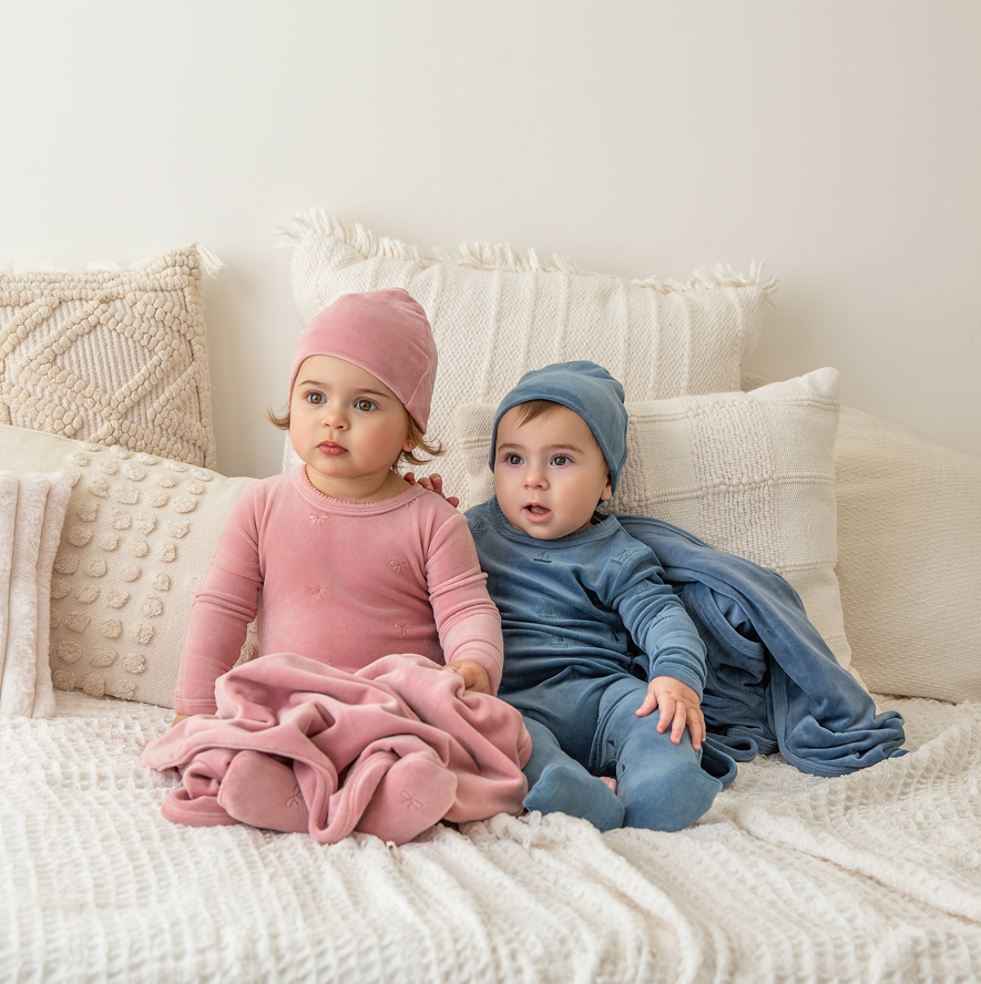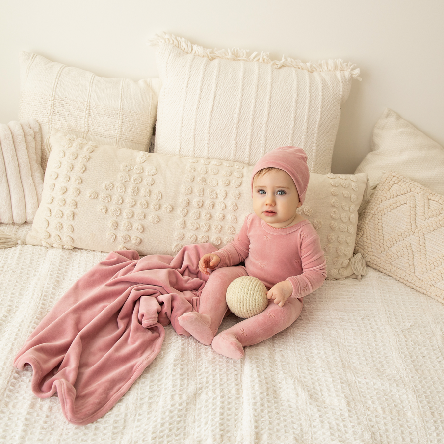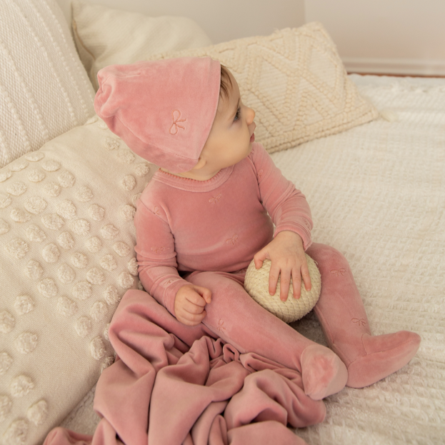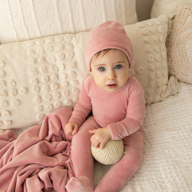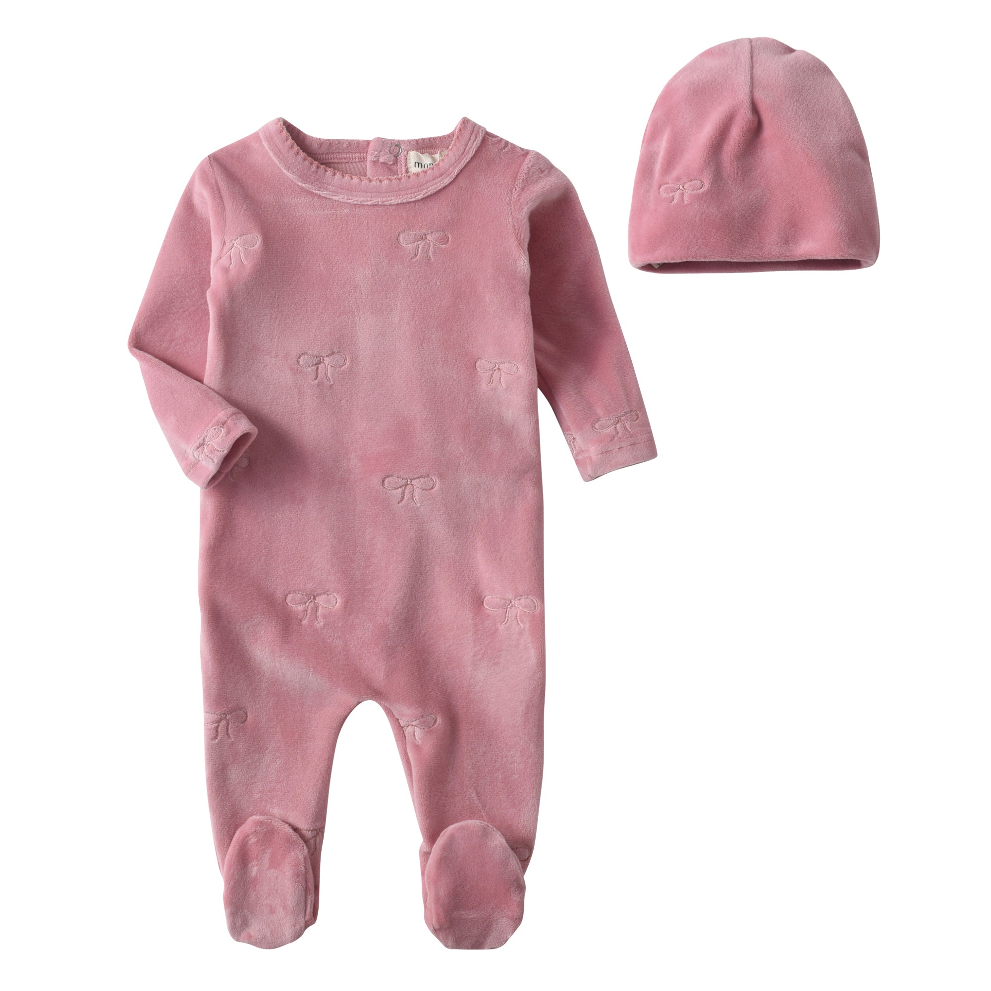This snug fitting footie is designed with embroidered bows detail and a back snap closure. Available in sizes 3-18 months. It come with a matching beanie. This footie is crafted with the softest cotton velour fabric for ultimate comfort.